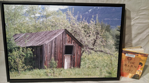 Sean Brown: Old Barn in Rosswood, BC - Springtime: Photo printed on canvas, suspended in box frame. Artist is Jeanette Brown: volunteers with the Terrace Photography Club and is a Northwest Coast Mountain artist from Terrace, BC. She likes macro-abstract nature themes, and capturing the austere beauty of abandoned things and places. Paired with the book: “The Barn” by Avi
