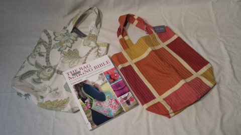 Chris Jack: Reversible Cloth Tote Bags: stylish eco-friendly carrying bags. One is made of an Outdoor Ultra Fibre cotton in muted Ukrainian Thistle, with an interior cotton in Squash Blossom; the other is a Raised Weave Canvas in a Mondrian pattern; with a pale peach cotton interior. These bags take 5 hours to create, at a cost of $20 in materials and retail for around $30. Chris has an outlet on Etsy: if interested ask library staff(auction separately) Displayed with “The Bag Making Bible” by Lisa Lam