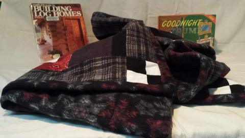 Trish Banighen: Flannel Lap Quilt: cozy quilt in “man-friendly” colours, reminiscent of fall, reading or watching sports, country living and time at the cabin. Trish has included a parody of the classic “Goodnight Moon”: “Goodnight Trump” for the lucky bidder’s reading pleasure. Paired with “Complete Guide to Building Log Homes”.