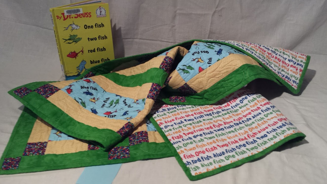 Sue Sullivan: Seuss-inspired Baby Quilt. Cotton front and back, really cute, bright and lively with a “One Fish Two Fish Red Fish Blue Fish” motif and a pieced back with a super-fun complimentary fabric. It took Sue about 10 hours to make (she's quick!) and cost around $80. Paired with********** you guessed it.