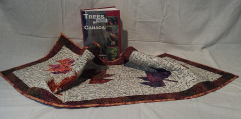 Sheila Seidemann: Autumn Leaves Table Runner: inspired by a recent trip up Highway 37, where Sheila was awed by the beautiful colours of the autumn leaves, including the rich gold of the larches which she hadn’t seen. She was interested and found information about larches (tamaracks) in “Trees in Canada” by John Laird Farrar.