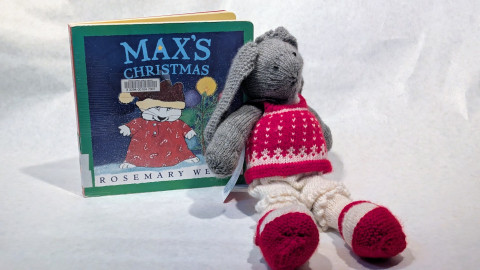 This bunny is granchild approved; a sister bunny given to Janice's grandchild years ago now sits on a top shelf reserved for very special toys. With it's red dress and slippers, it's ready to meet someone special this Christmas.