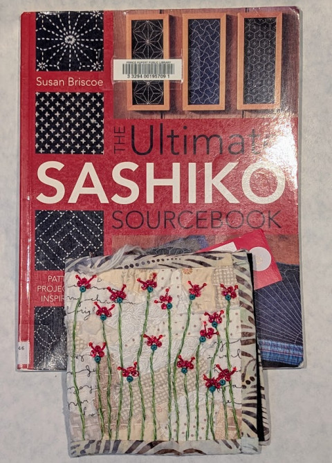 This is a Japanese 'Boro' inspired piece. Boro is an ancient tradition of placing raw-edged fabric over damaged fabric holding it in place with fancy stitches; the modern version of this practice is sometimes called slow stitching. Colored threads, beads, ribbons and such stuff have been added to complete this piece.