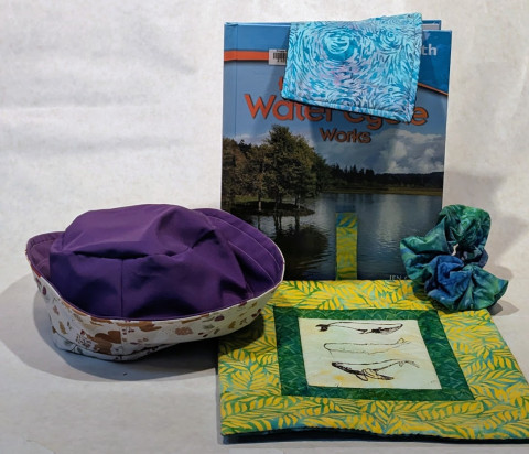 This set contains four handcrafted, locally made items featuring cloth from Rain Forest Fabrics: a jar opener with a watery droplet pattern, a blue-green hair scrunchie, a pot holder featuring whales, and a bucket hat to keep your head dry.