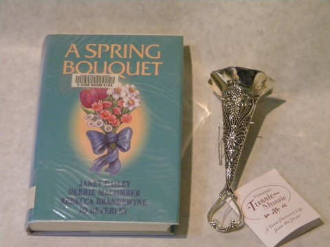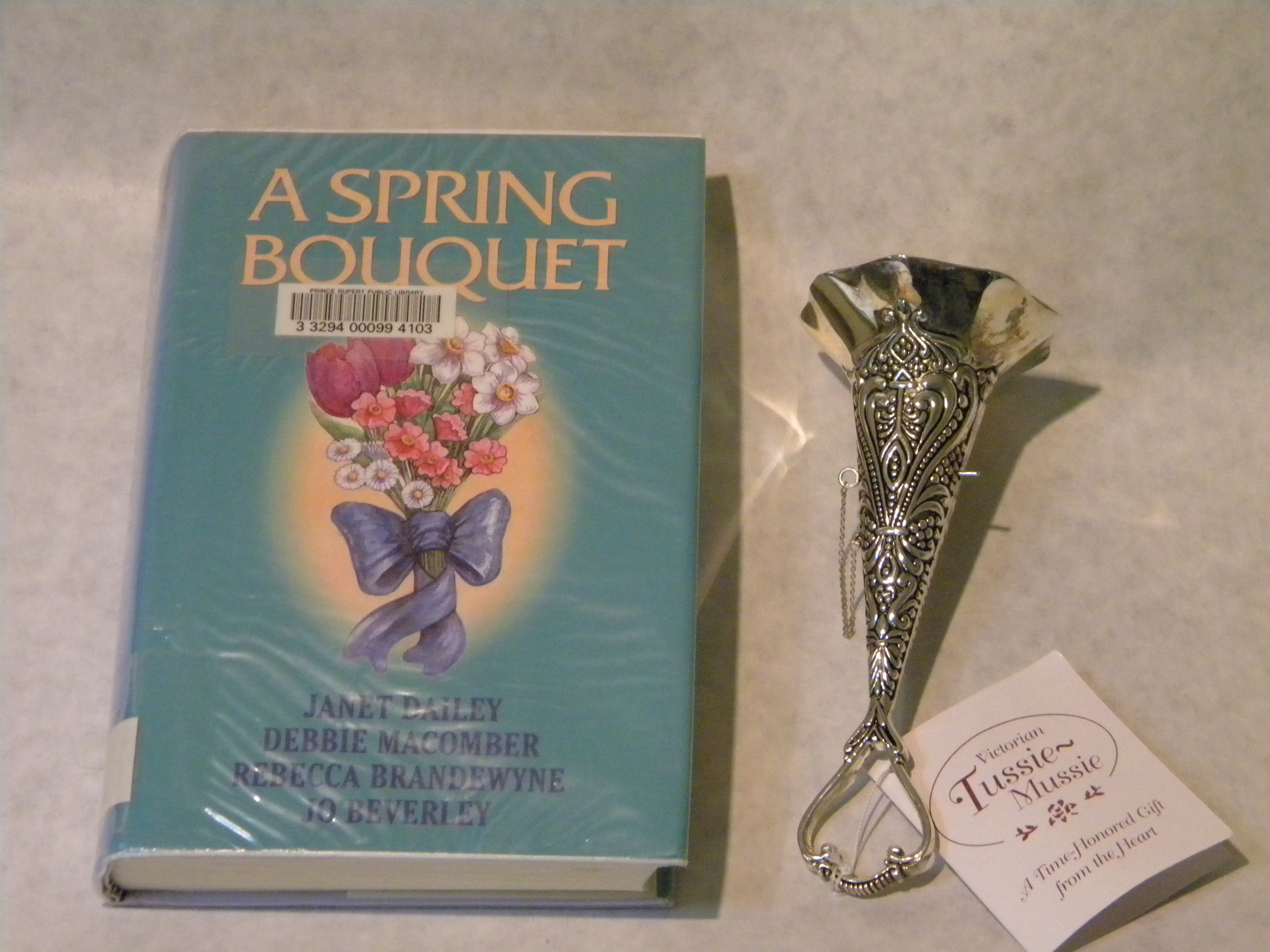 This silver bouquet holder is a beautiful way to hold flowers, perhaps on a wedding day or other significant occasion. Donated by Coral and James Carr, it has been coupled with A Spring Bouquet, a collection of short stories. The pin is pushed through the stems of the flowers to keep them secure.