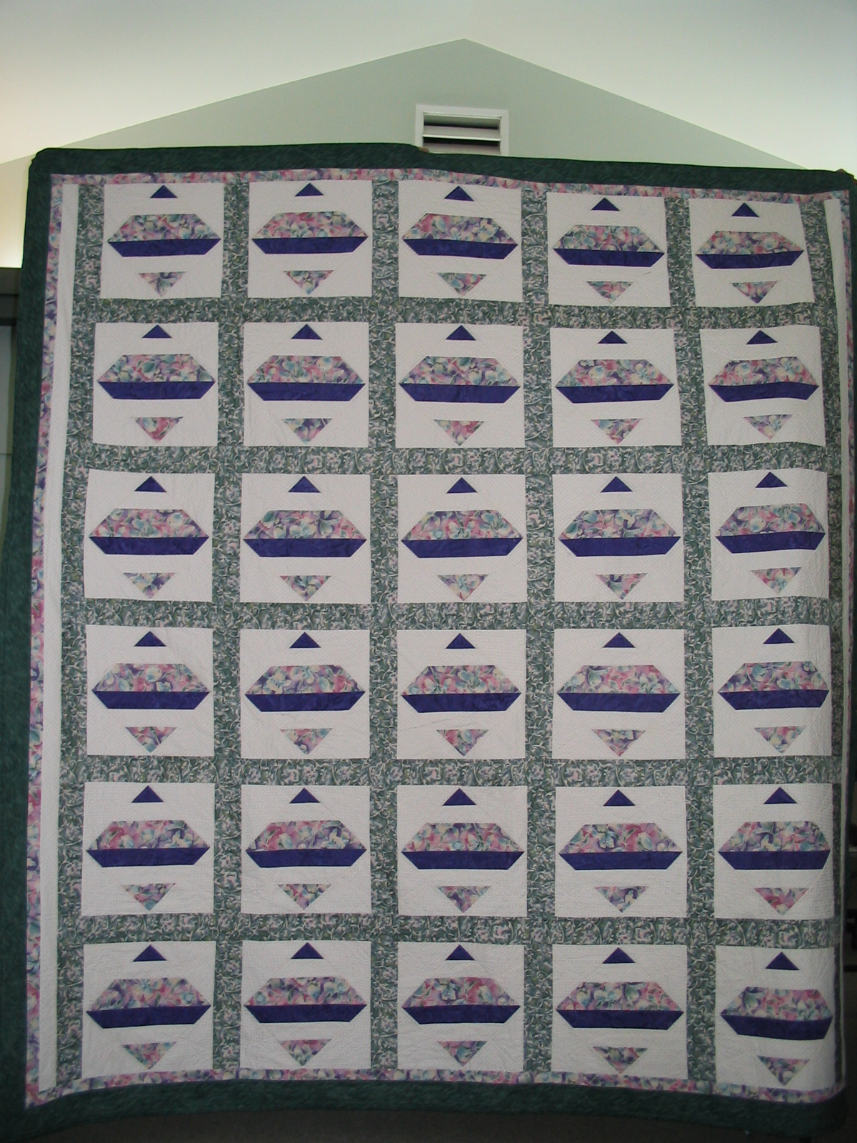 This quilt was made by Ceu Cunha for her daughter Florbela. Ceu had originally made a different quilt for Florbela for Christmas 2001, but it was stolen in Vancouver before Florbela even had a chance to see it. Ceu made this as a replacement, completing it in April 2002.