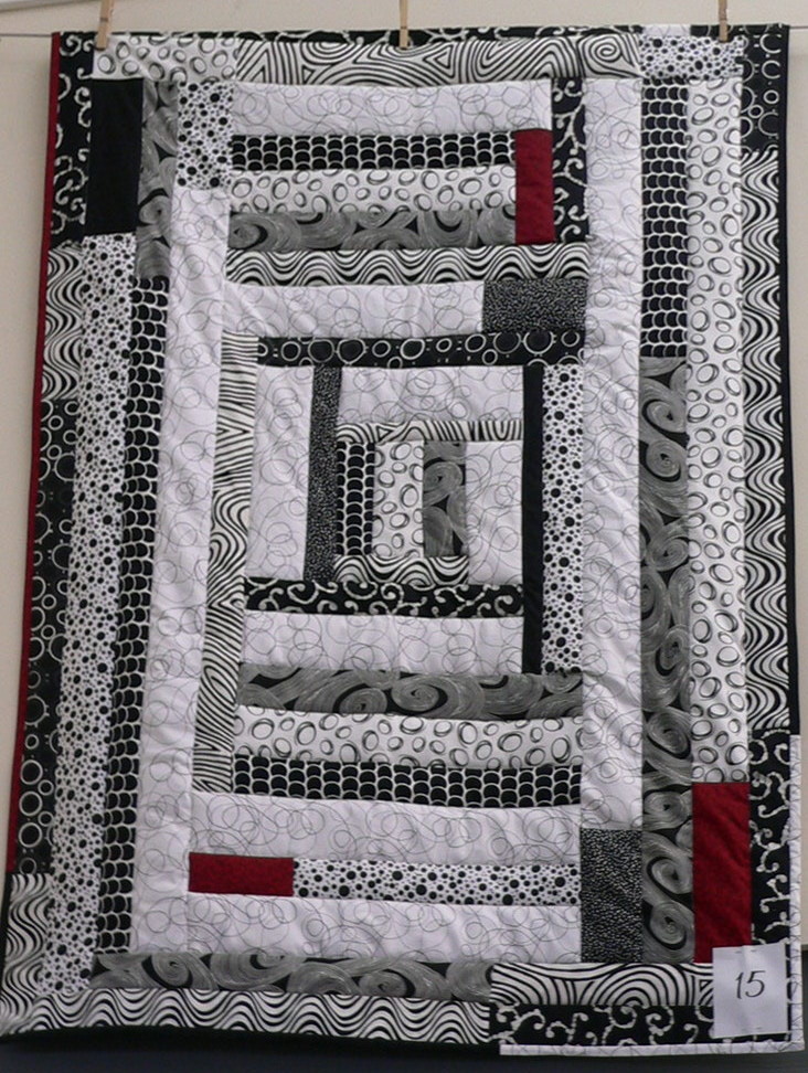 "I have collected black & white fabric for three years. Just a quarter of a metre at a time. At the start of this year, I decided it was time to try and use it. A lot of the collection is not in this quilt. Tones of blacks and whites are quite dissimilar and when put together look quite gray. It became the size it is because I ran out of the black & white fabric I chose to sew together. I used the leftover solid colours for the back and sewed in small leftover pieces for contrast. I had fun making both sides of this quilt."