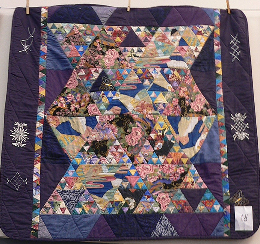 Gale tells us that she made this Asian theme quilt during a class with Pam Mahoney. The embroidered detailing was done with a sewing machine with an embroidery attachment. Gale made this quilt in 1999.