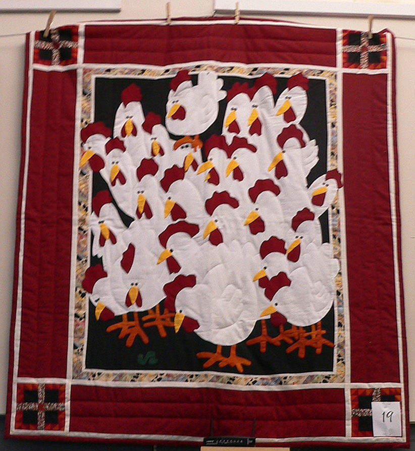 "I made this quilt "The Early Bird Gets the Worm" several years ago after seeing it done by a friend. The chickens are all appliqued onto the quilt. If was fun to do."