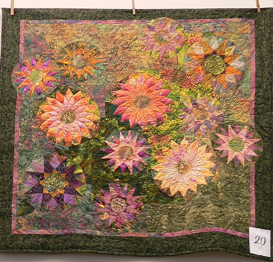 Pam developed this design from the traditional Sunburst quilt design combined with star patterns to create a garden. This quilt was template pieced and paper pieced.