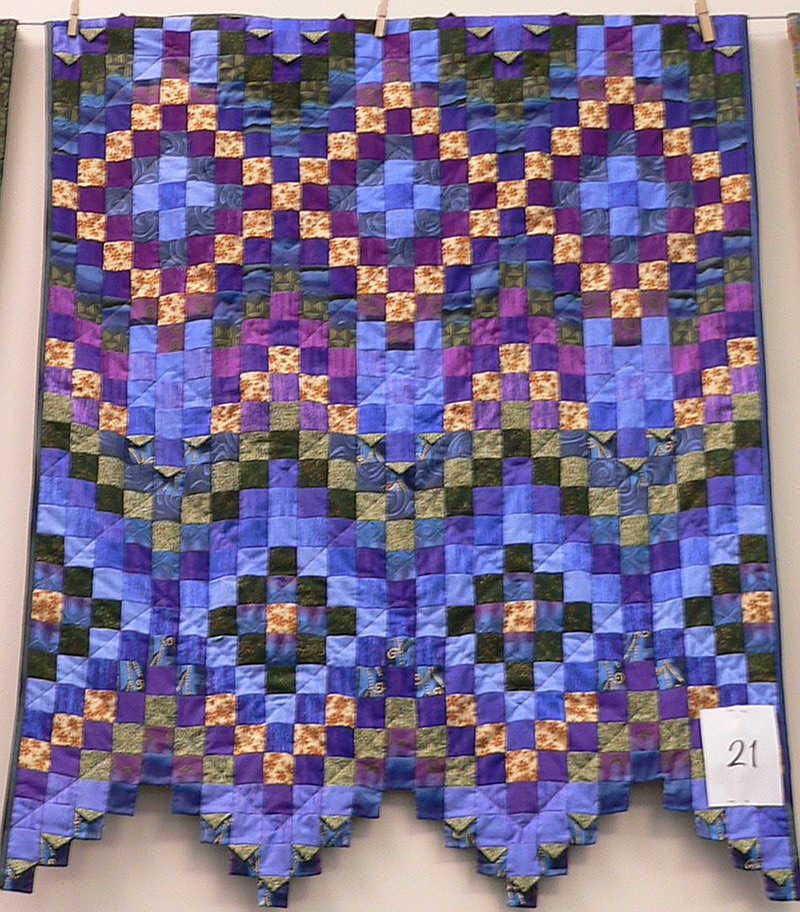This quilt was a challenge using 3 pieces of fabric. Gale says she'd never made Prairie Points before and the colours are her favourites! The "stairs" are like the many short flights in Gale's house. The quilt was made as part of a Guild challenge in 2001.