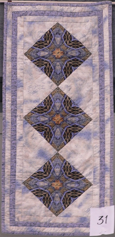 The triangles in the table runner were cut from fabric that had identical repeat patterns. A template was positioned on the matching patterns for each triangle to create a flow of lines and to give a kaleidoscope effect.