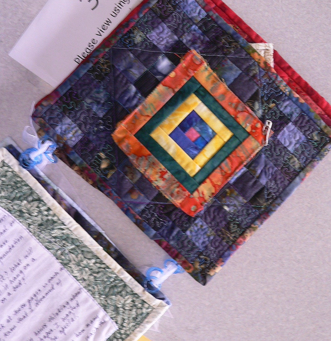 This beautiful quilted book was dreamed, thought out, pieced and quilted by Adrienne in March 2009. The book includes the following blocks: Rags to Riches; Cloth of Heaven; Colour Wheel; Pieced Log Cabin;9 Patch Sandwich; Pond Life; Towhee.