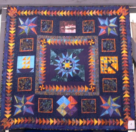 When I thought of making a quilt for Dad, I knew it had to start with a Mariner's Compass block. For the background of this block, I tried to mimic the deep dark green of the ocean during a southeast storm. Other blocks included are: Pine Tree – this is meant to symbolize Dad's love of the woods, and of his never ending pursuit of good firewood; Sail Boat – included because of the the boat theme; Card Tricks – symbolizes Dad's enjoyment of Cribbage games; Northern Lights Blocks – in the four corners to symbolize the love of home here in northern British Columbia and the fascination we all have with the northern lights; Maple Leaf – four in the outer border for our pride in our homeland.