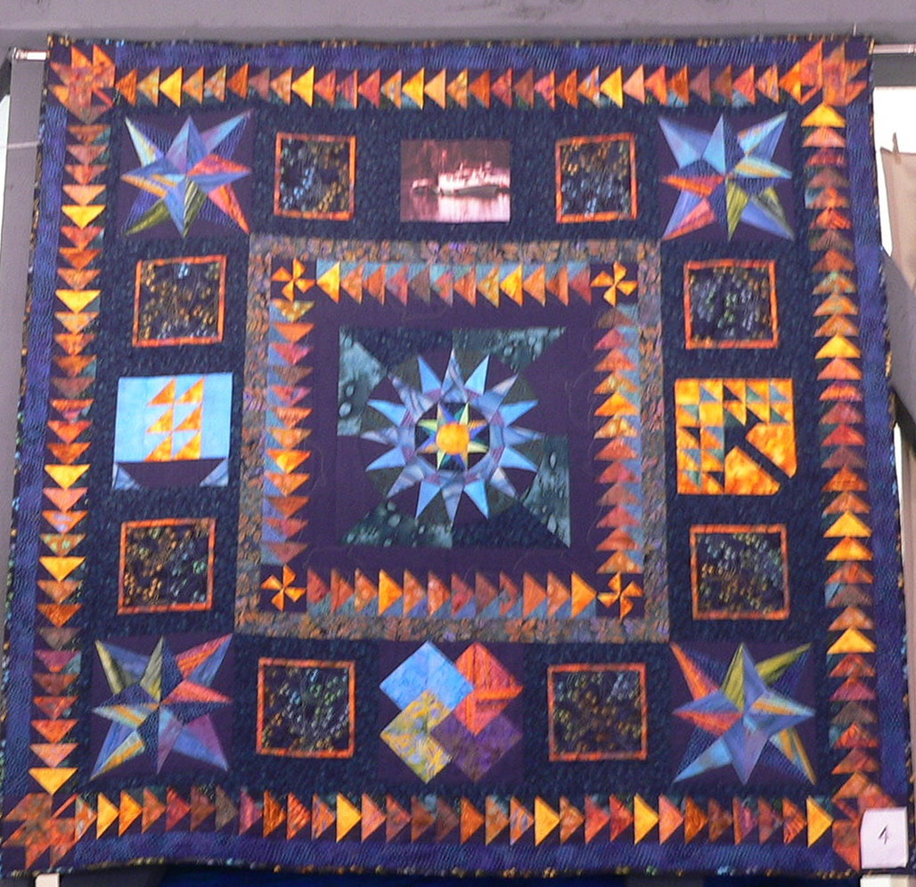 "I made this quilt for my Dad, Dave Martin. Dad has always loved boats, and when I was growing up, boats were always in our lives. There were rowboats, punts, runabouts, hydroplanes, skiffs and probably even some I don't remember. In 1970. Dad bought the 40 ft. pleasure craft, the Beach Tramp which is pictured on the quilt. We didn't know how prophetic the name was at the time, but we enjoyed many years of traveling to secluded beaches and bays and islands around the north coast on that wonderful boat, which he still has.