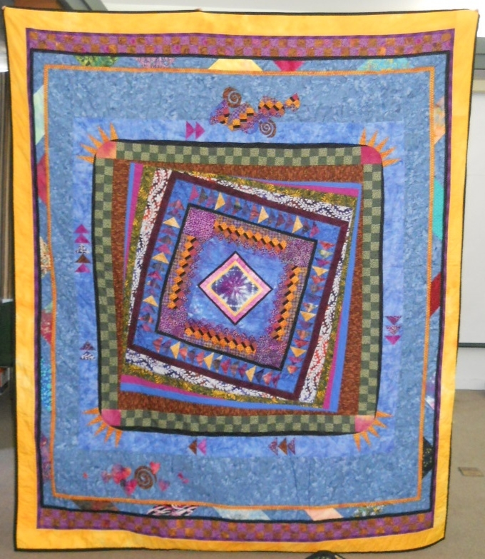 This colourful quilt is the result of a quilting challenge in 2008-9 based on the style of quilting we, the loosely organized Coastal Quilters and friends, learned from Kristin Miller and her book The Careless Quilter. Some of the Coastal quilters have been quilting together since the 1970s.