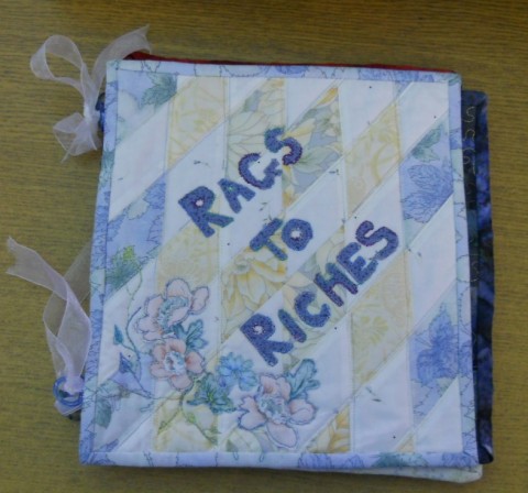 The book includes the following blocks: Rags to Riches; Cloth of Heaven; Colour Wheel; Pieced Log Cabin; 9 Patch Sandwich; Pond Life; Towhee. Adrienne made this book to give examples of how a quilt is made.