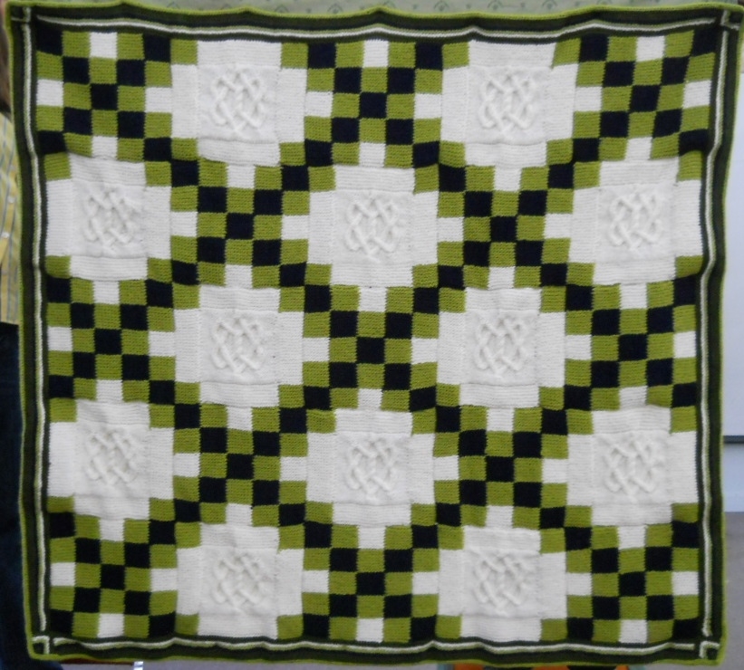 As an everyday knitter and a quarter-time quilter, I have always been intrigued by traditional quilt blocks and wondered how they would turn out as an afghan. Recently I have been messing around with modular knitting and the much maligned garter stitch. In January I set myself the goal of knitting a Double Irish Chain afghan using modular knitting (one small block at time) and only yarn I currently owned (in the end I needed to purchase one more ball of white yarn, otherwise consider the stash busted!). I dressed up the white blocks where traditionally one would find a lovely quilted motif with a cable knit Celtic knot. I was just finishing my project when the library began looking for submissions for this year's quilt show. With a respectful nod to the highly skilled quilters in this community I present, with deference, my knitting homage to the fine art of quilting.