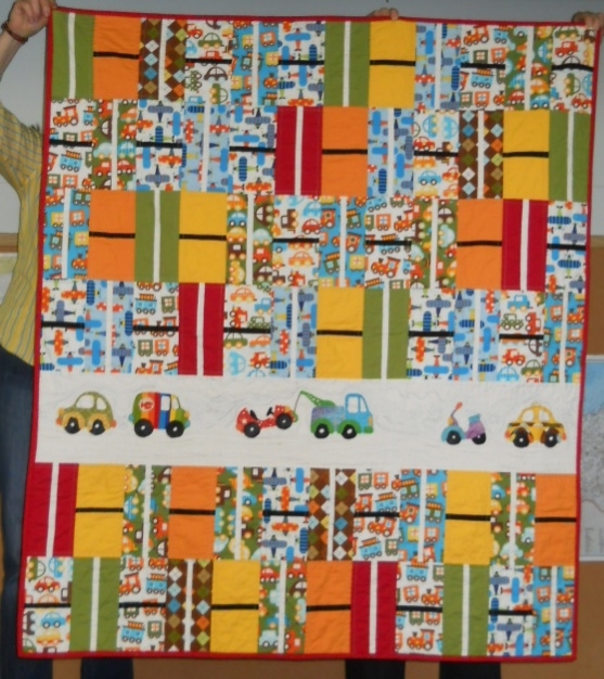 This quilt was created because I wanted to find a way to showcase a new line of organic fabrics that had come into the store. I looked online and and found a project by Elizabeth Hartman (called Birthday Cake) that I liked, so I tried to create something like it, but with something fun in it to draw the eye. I ended up creating the center applique panel with some fabulous little vehicles on a busy street. I had a lot of fun quilting this one, and drawing the air movement and exhaust around the cars.