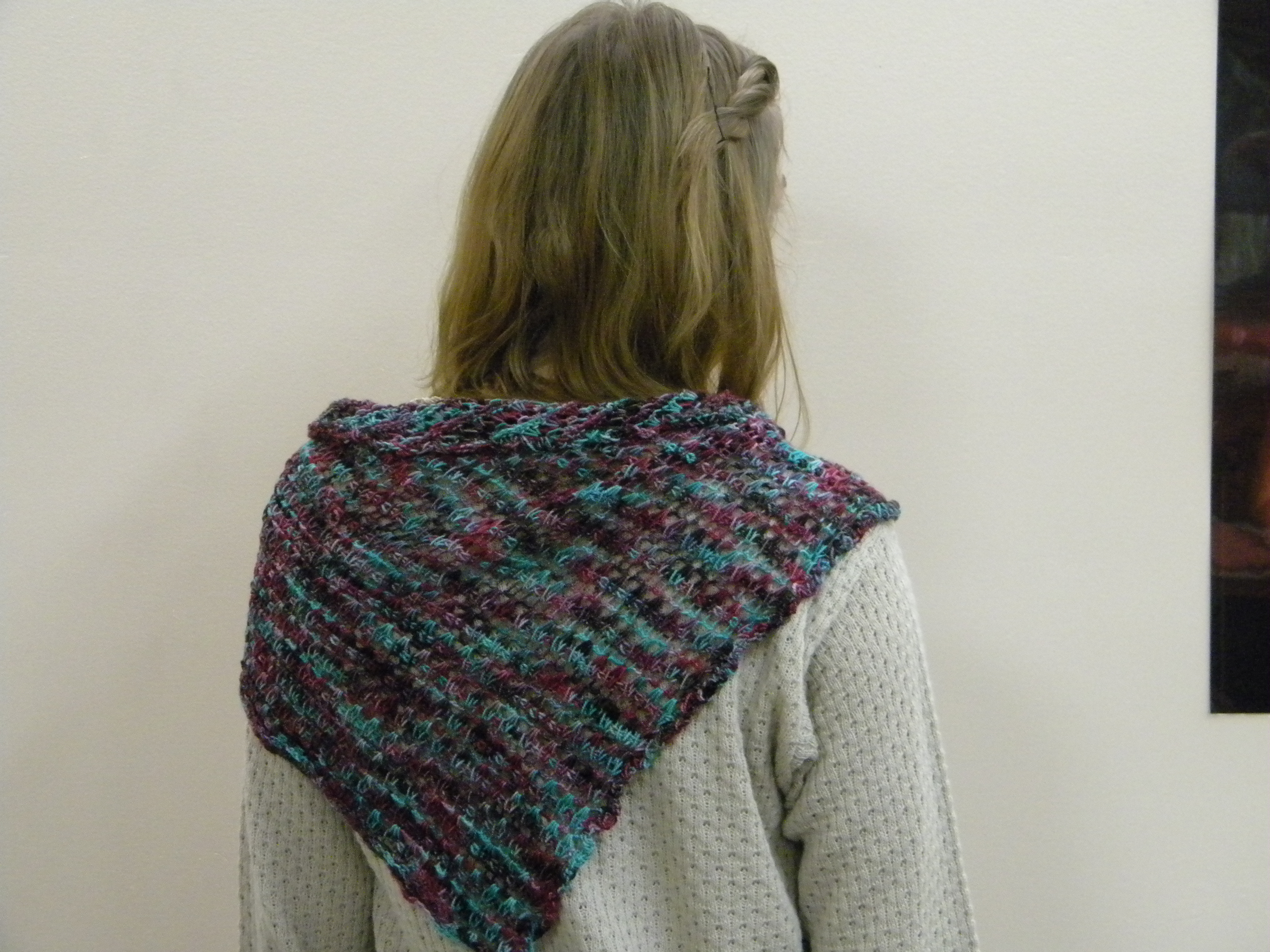 Leah stumbled into Tunisian crochet in the past year and has been astounded by the variety of stitches that can be created. Tunisian Crochet is a cross between knitting and crochet, with the best of both worlds. This shawlette was designed to tie at the shoulder hence it's non-traditional right triangle shape. It took about 30 hours to make and $42.00 worth of hand painted merino wool. A great book to check out is Get Hooked on Tunisian Crochet by Sheryl Thies [1]. (Special thanks to Mercedes for agreeing to model this one!)