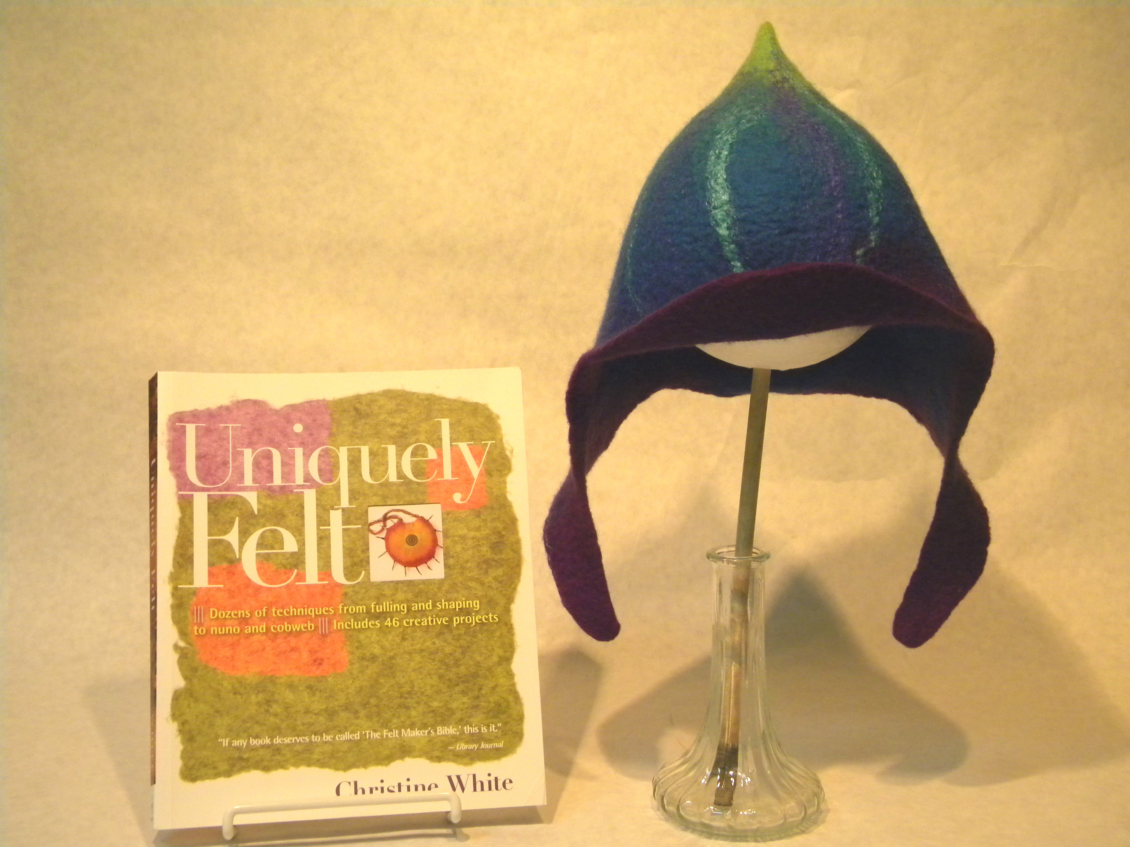 Jenny wet felted this hat made of 100% merino wool fibres and Tussah silk stands. Jenny was inspired and self-taught using techniques explained in the book “Uniquely Felt” by Christine White. Jenny has kindly loaned the book to us for the auction, sorry, it's not for sale!