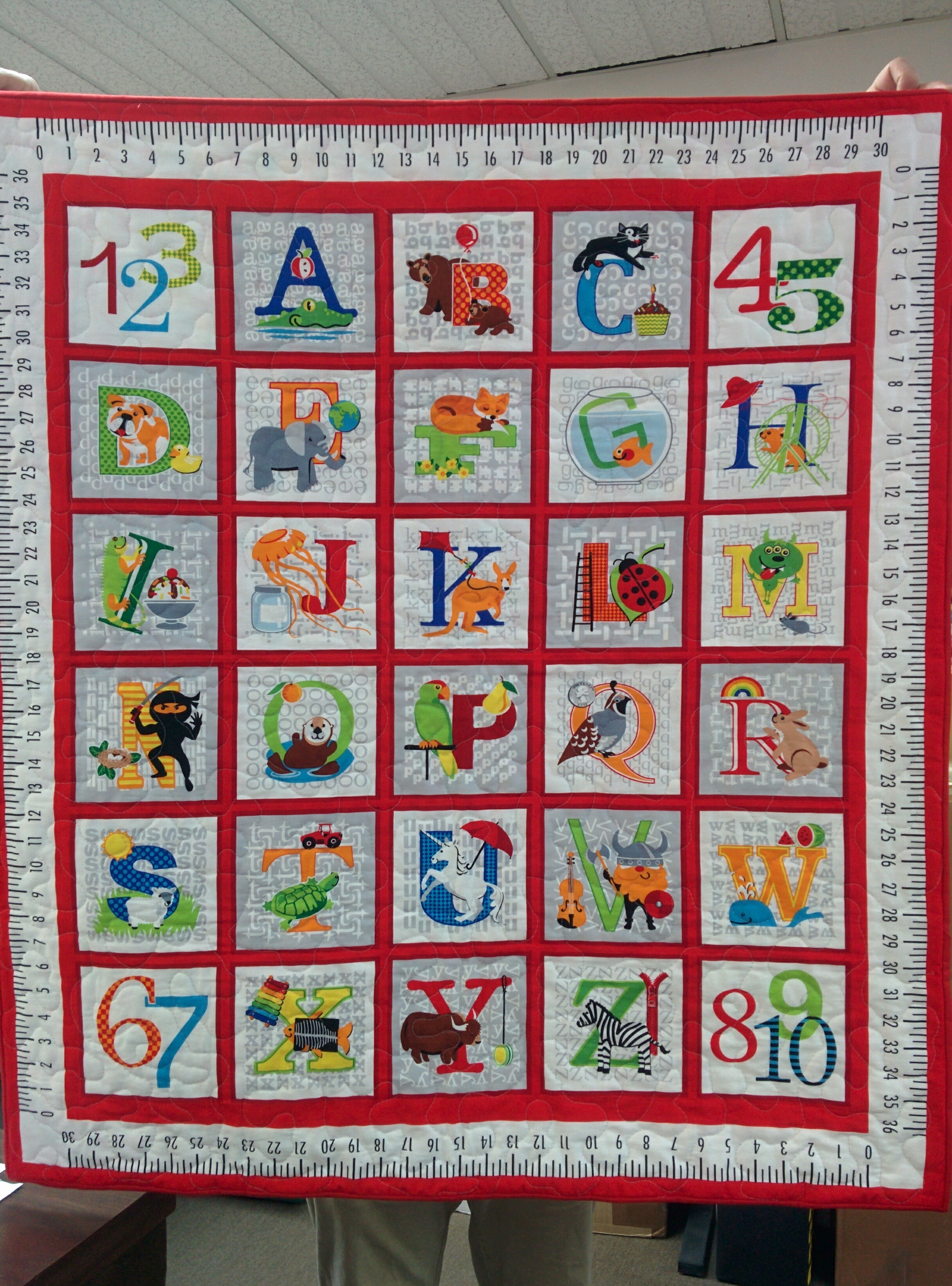 Donated by the skilled sewist at our new fabric store! This colourful small quilt would be great for a stroller, car seat, crib, or for you as you rock your baby wrapped in your arms. We paired this quilt with A to Z, by Sandra Boynton [1].