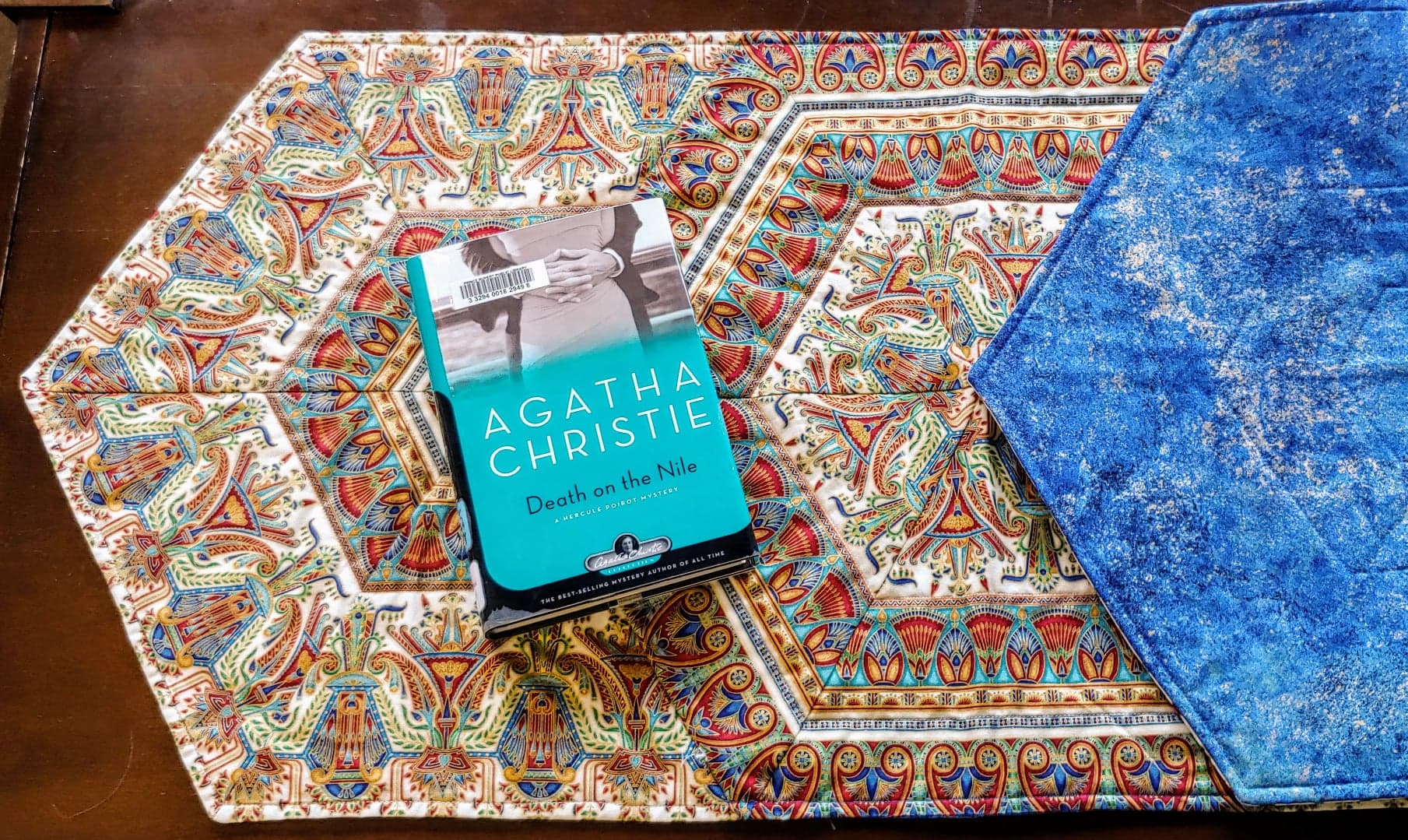 Sandra Duffus: Egyptian-Fabric Pieced Table Runner: spectacular pieced 43” table runner, carefully pieced to get repeats of the design. Sandra found it challenging and time consuming, but fun. It took her around 27 hours to create, the materials cost around $45 and she would like a minimum bid of $60. Even the backing material is gorgeous. Her chosen book is the classic whodunit “Death on the Nile” by Agatha Christie.