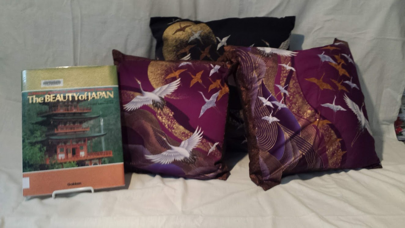 Trish Banighen: Japanese-Fabric Pillows: once again, Trish has generously made gorgeous pillows from the fabric bequeathed to her by the late Jean Clerihue. She chose to feature the exotic lush print as whole image. We have paired the pillows with “The Beauty of Japan” as the beloved cranes feature large in Japanese design and culture.