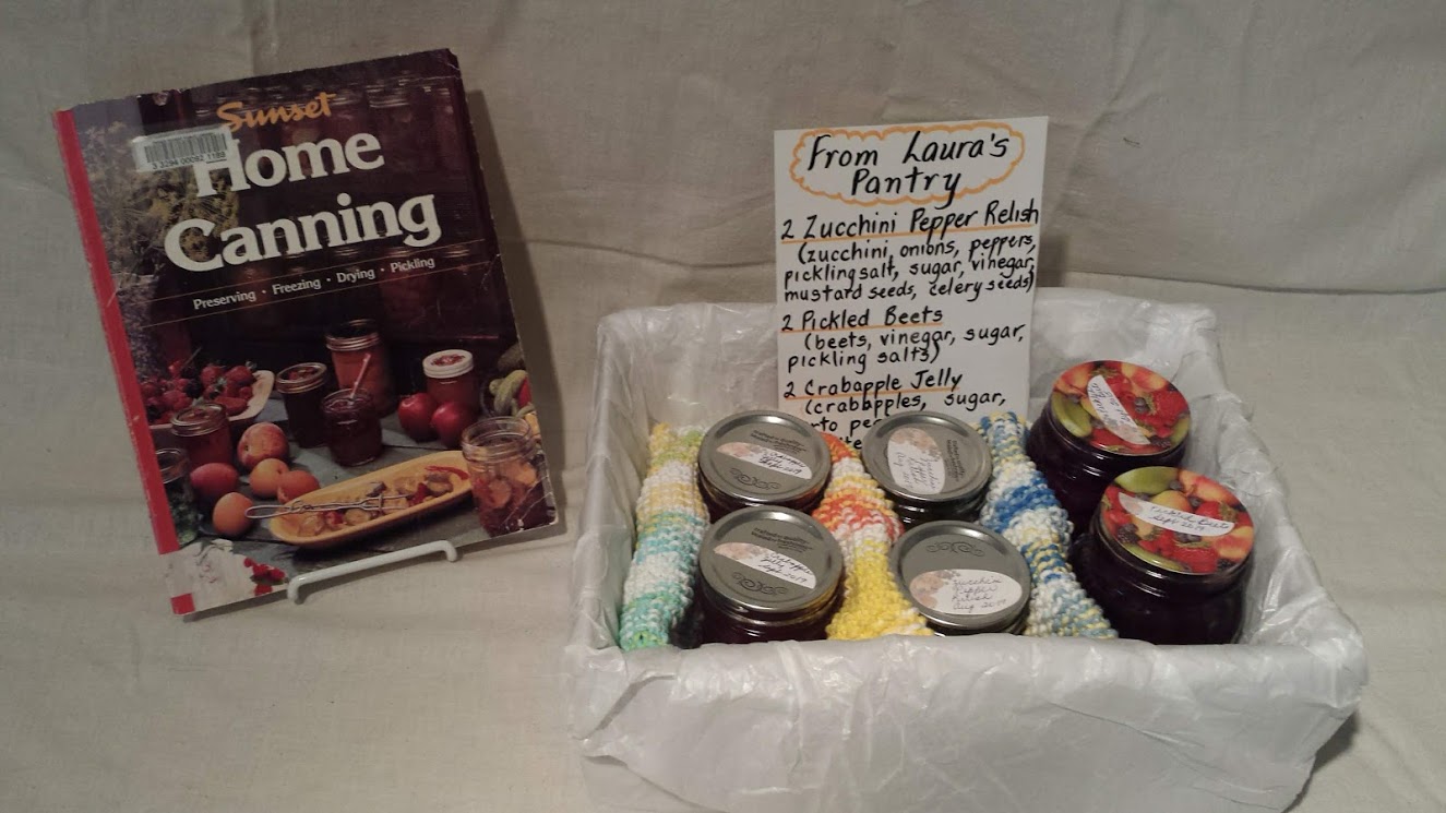 Laura Esposito: Basket of Home Preserves With 3 Hand-knit Cotton Dishcloths: Preserving food has been part of Laura's life since early childhood, with her mother and nonna (grandmother). Knowing the ingredients and their provenance is part of the pleasure: the beets are from Fraser Lake, the crab-apples from Smithers and the zucchini and peppers from Penticton, all from friends. Buon appetito! The Sunset “Home Canning” is only one of the library's many books on the subject.