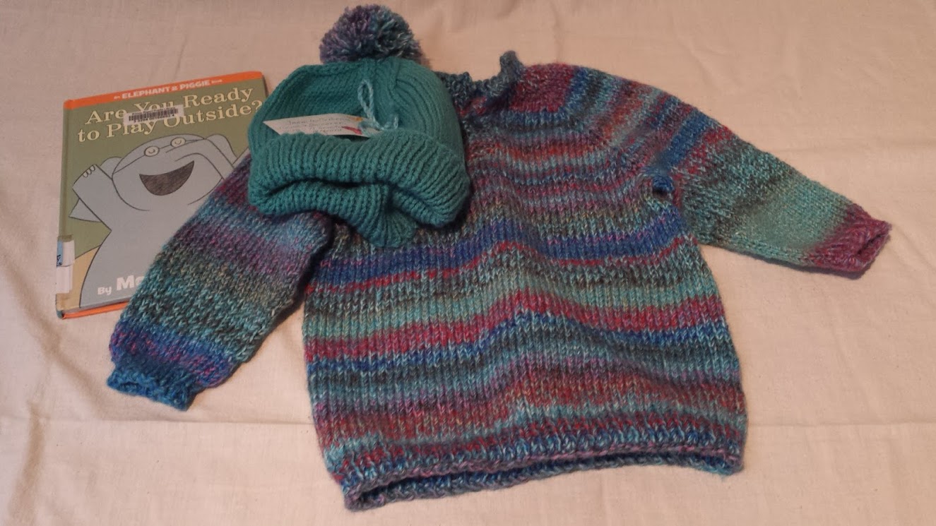 Patricia Toye: Child’s Tuque and Sweater Set: sized for 18 months, but would also fit an older child, a Henley-style opening at the neck for ease in putting on. Paired with “Are You Ready to Play Outside?” by Mo Willems