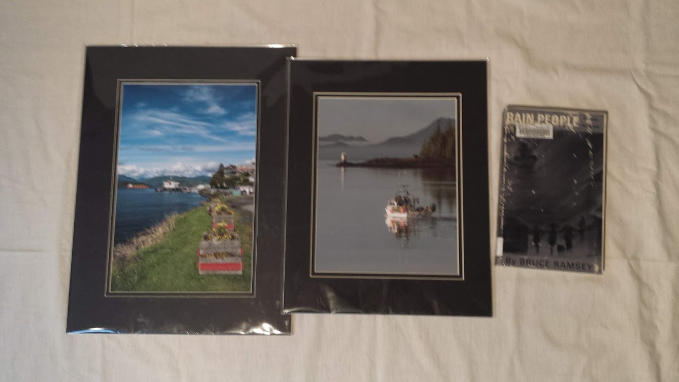 Allan Colton: Frame-able Photographs: 2 frame-able photographs with double matts: one of a boat laden with prawn gear leaving Porpoise Harbour, and one of Cow Bay, which includes a disabled coal ship that was tied up for a time. Also included with each is a card. Retail Value: $50. Auction separately. Paired with “Rain People: the story of Ocean Falls” by Bruce Ramsey, where Allan was born.