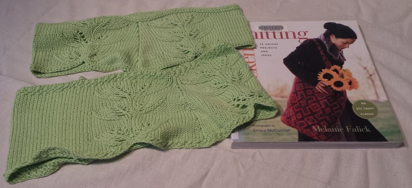 Sean Brown: Cowls by Mary Bond Draped cowls made from Bamboo/Cotton blend yarn, in “Lime Green”, with a beautiful leaf pattern and a rolled and twisted cable edging. Auction separately. Paired with “Weekend Knitting” by Melanie Fallick.