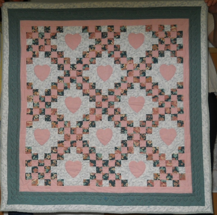 I made this little quilt many many years ago (circ. 1989) when my now adult children were toddlers. The quilting and the applique were done by hand. It's amazing when I think back to myself as a working mom and all the hand quilting I did when my 3 kids were under the age of 5. I laugh at myself because now I'm trying to learn free motion quilting on my sewing machine because I'm too busy to quilt by hand! I'd love to regain the energy and organization skills I had when I was in my twenties – but it makes me tired just thinking about it. :-)